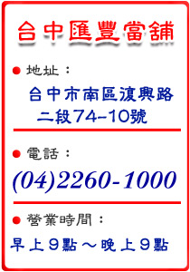 請您務必慎選安全的融資管道,現在有一些不肖業者只留行動電話、沒有地址、沒有店面,,基本上那些就都是所謂的地下錢莊、吸血蟲、前面和您接洽好好的,後來就巧立名目,胡亂收費。請您務必找政府立案的合法質借公司,台中匯豐當舖是符合政府立案的合法質借公司,讓您安心借貸,做您一輩子的靠山!